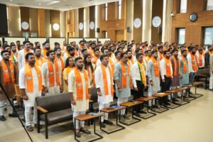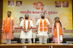 ગાંધીનગર (કોબા) – ભાજપા પ્રદેશ કાર્યાલય ‘શ્રી કમલમ’ ખાતે ગુજરાત પ્રદેશ યુવા મોરચાની નવરચિત ટીમની પ્રથમ પ્રદેશ બેઠક ઉત્સાહભેર યોજાઈ હતી. આ બેઠક પ્રદેશ યુવા મોરચાના અધ્યક્ષ ડૉ. હેમાંગભાઈ જોષીની અધ્યક્ષતામાં અને પ્રભારી કિરીટભાઈ પટેલની ઉપસ્થિતિમાં યોજાઈ હતી. રાજ્યભરના યુવા મોરચાના પદાધિકારીઓ, જિલ્લા તથા મહાનગરના પ્રતિનિધિઓ મોટી સંખ્યામાં ઉપસ્થિત રહ્યા હતા.