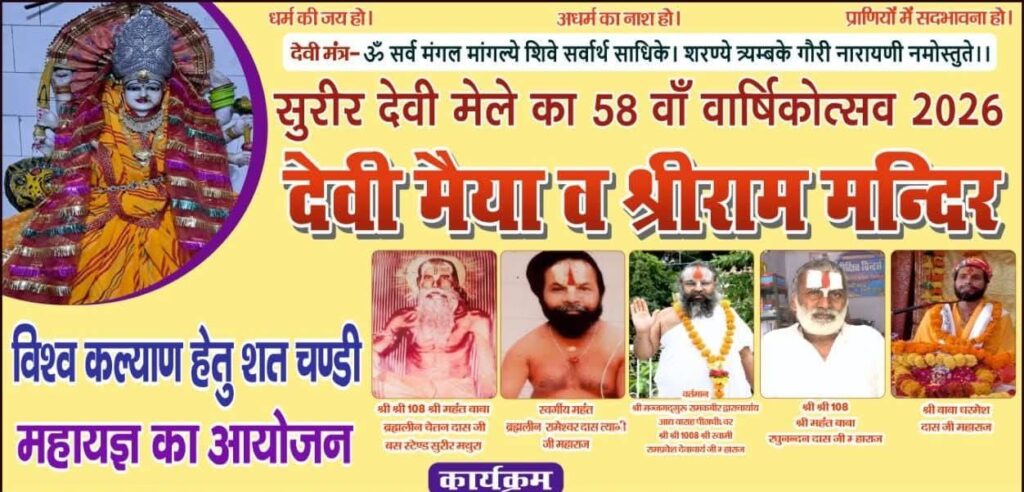 ब्रज क्षेत्र के प्रसिद्ध कस्बा सुरीर स्थित देवी मैया एवं श्रीराम मंदिर परिसर में इस वर्ष सुरीर देवी मेले का 58वां वार्षिकोत्सव बड़े ही धूमधाम और धार्मिक उत्साह के साथ मनाया जाएगा। विश्व कल्याण की कामना के साथ यहां 18 मार्च से 29 मार्च 2026 तक शतचंडी महायज्ञ का भव्य आयोजन होगा। मेले को लेकर क्षेत्र में अभी से श्रद्धालुओं और भक्तों में उत्साह देखने को मिल रहा है।