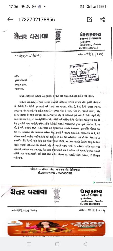 મહીસાગર જિલ્લાના કલેકટર નેહા કુમારીને સસ્પેન્ડ કરી કાયદેસરની કાર્યવાહી કરવા મુદ્દે આજે આમ આદમી પાર્ટીના ધારાસભ્ય ચૈતર વસાવાએ ગુજરાત રાજ્યના મુખ્ય સચિવને પત્ર લખી આવેદનપત્ર પાઠવ્યું હતું, જેમાં ધારાસભ્ય ચૈતર વસાવાએ જણાવ્યું હતું કે છેલ્લા કેટલાય દિવસોથી મહીસાગર જિલ્લા કલેકટર નેહા કુમારી વિવાદમાં છે. તેઓનો એક વિડિયો ગુજરાતમાં અને દેશમાં ખૂબ વાયરલ થયેલ છે, જેમાં તેઓ તાલુકા સ્વાગત કાર્યક્રમના મંચ ઉપરથી એક દલિત યુવાનને “ચપ્પલ ખોલ કે મારને જૈસા હૈ, હરામી સાલા” એવું કહેતા સંભળાય છે. આવું કોઈપણ વ્યકિતને જાહેરમાં કહેવું એ હકીકતમાં ગુનો બને છે. તેઓ વધુમાં એવું કહેતા સંભળાય છે કે, “90 ટકા એટ્રીસિટીના કેસો દલિતો અને આદિવાસીઓ બ્લેકમેઇલ માટે કરતા હોય છે”. નેહા કુમારીએ આવા શબ્દોનો પ્રયોગ કરીને એટ્રીસીટી એક્ટની જોગવાઈઓ મુજબ ગુનો આચરેલ છે.