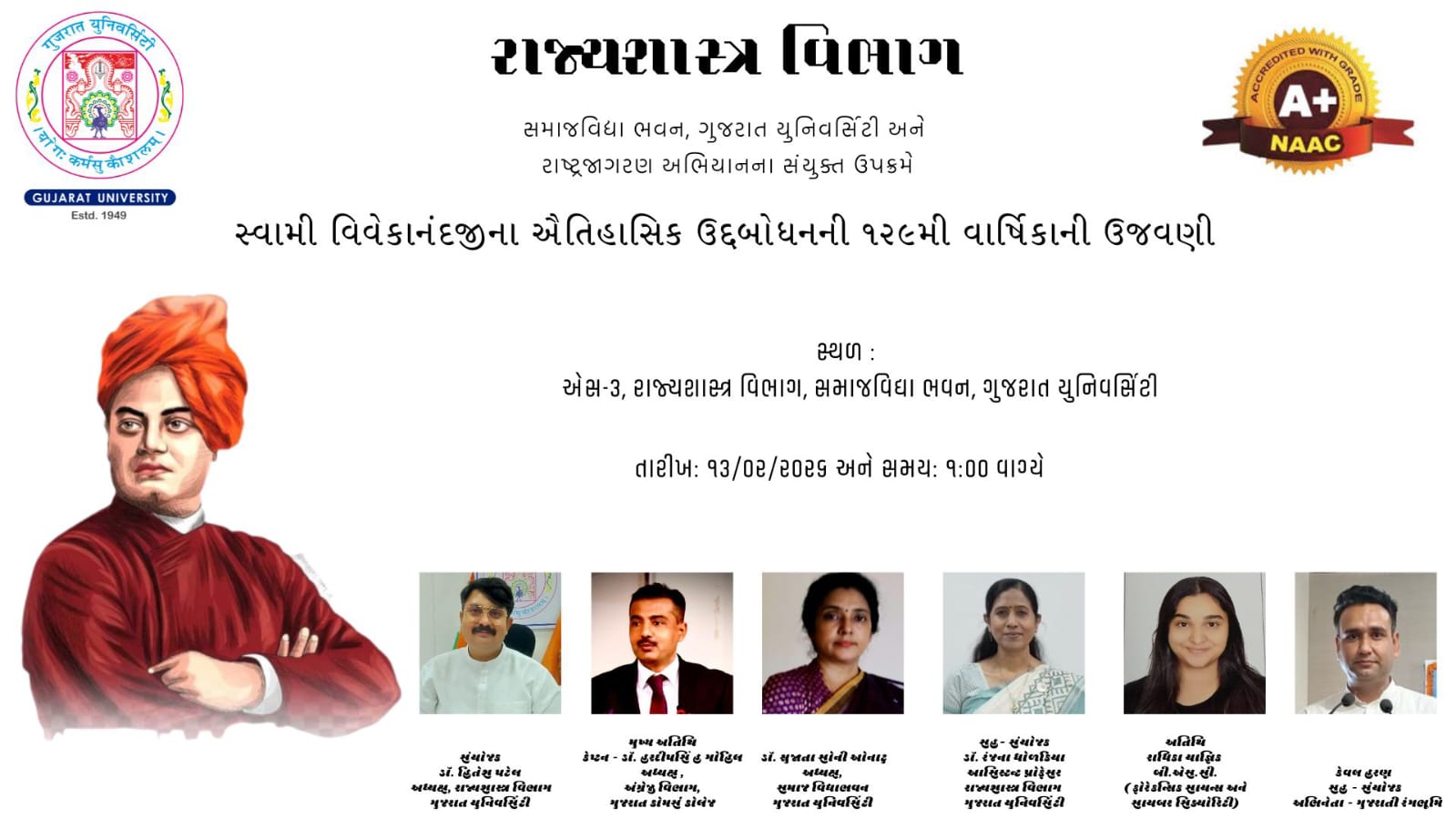 અમદાવાદ : રાજ્યશાસ્ત્ર વિભાગ, ગુજરાત યુનિવર્સિટી દ્વારા Swami Vivekanandaના ઐતિહાસિક શિકાગો ઉદ્દબોધનની ૧૨૫મી વર્ષગાંઠ નિમિત્તે વિશેષ કાર્યક્રમનું આયોજન કરવામાં આવ્યું છે. આ કાર્યક્રમ રાષ્ટ્રીય જાગરણ અભિયાનના સંયુક્ત ઉપક્રમ તરીકે યોજાશે.